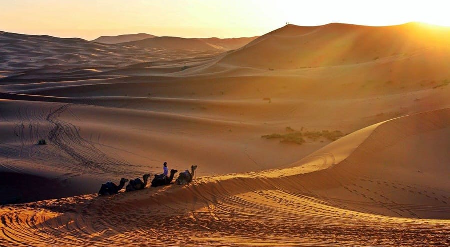 Despierten temprano para un mágico amanecer en el Sáhara, luego regresen en camello y partan hacia Fez. Conduzcan a través del pintoresco Valle del Ziz y los bosques de cedros cerca de Midelt, con una parada en la encantadora ciudad alpina de Ifrane, a menudo llamada "la Suiza de Marruecos". 🛏 Alojamiento en Fez.